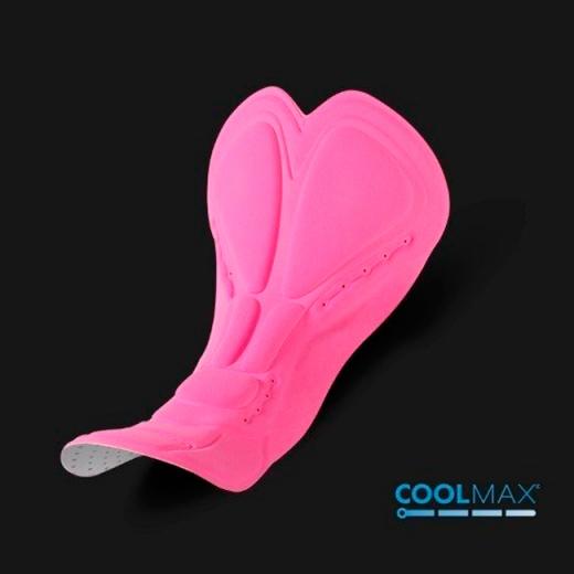 A forração CoolMax fabricada exclusivamente para a anatomia feminina, confere proteção para a pele graças aos mesmos tratamentos dos demais tecidos, além da proteção anti microbiana, ideal para utilização entre 2 a 4 horas sobre o banco da bicicleta.