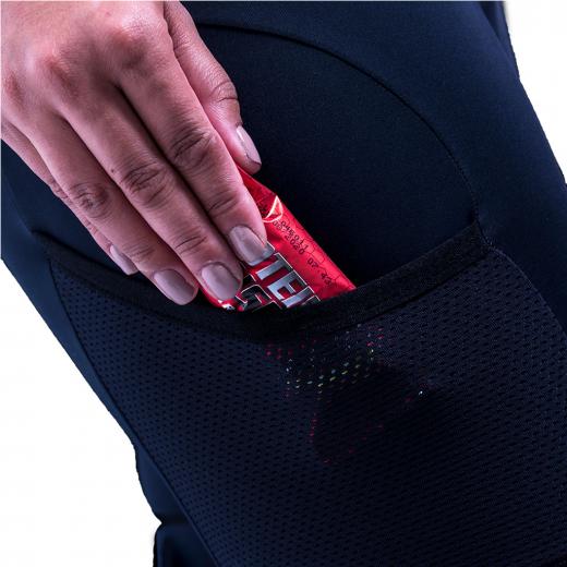 O Bretelle Essentials Feminino ainda conta com um bolso micro perfurado na lateral das pernas, que permite que a ciclista transporte alguns objetos e equipamentos que são de maior importância, como: carbo-geis, documentos, ferramentas, com muito mais segurança