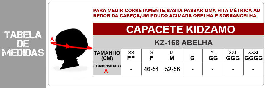 Confira as medidas do Capacete infantil feminino Kidzamo Abelha: