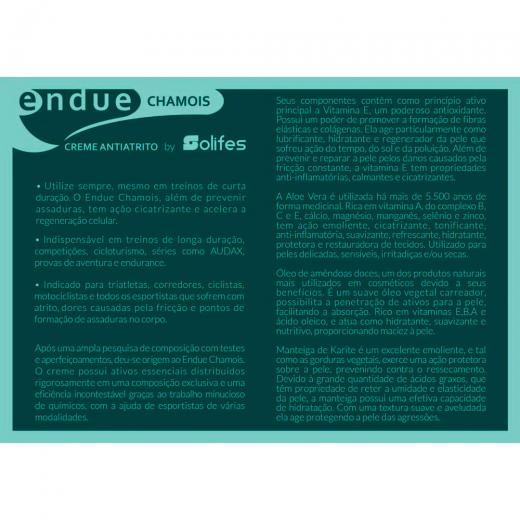 Creme Antiatrito Solifes Endue Chamois Sachê é indicado para qualquer atividade física de longa duração. Na sua composição a Vitamina E atua como anti oxidante, formando fibras elásticas e ajudando na produção de colágeno, que melhoram a condição de resistência da pele.