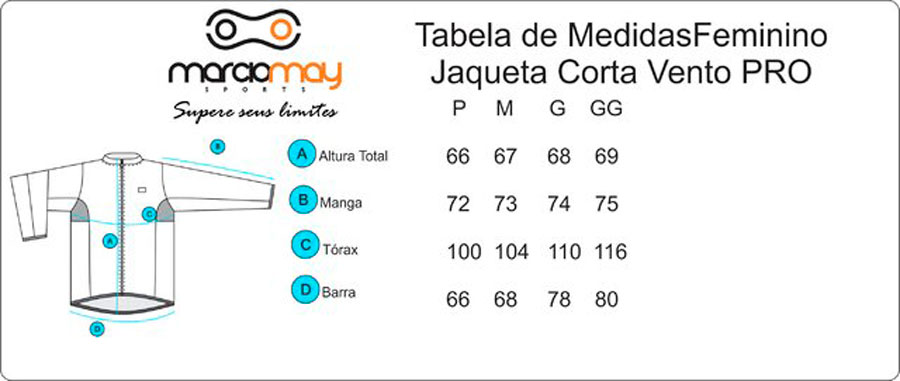 Confira as medidas da Jaqueta Corta Vento Feminina Marcio May Pro: