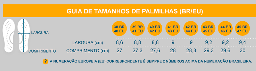 *Em nosso site as numerações já estão convertidas para o padrão Brasil, por isso, não se preocupe ao ver na caixa ou na palmilha uma numeração diferente, já que as sapatilhas são importadas e possuem a numeração padrão Europa (EU) dois números a mais que o padrão do Brasil.