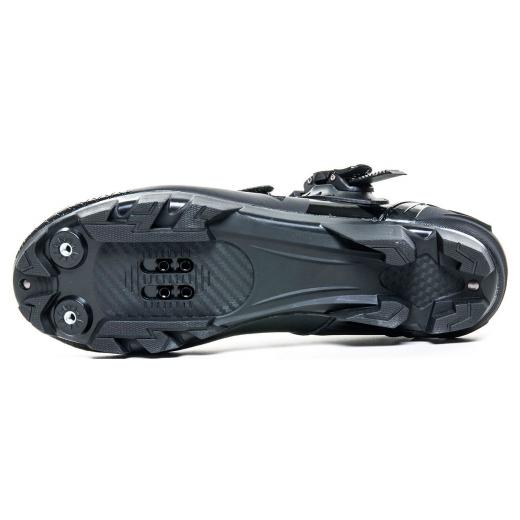 • Solado em dupla composição - produzido em nylon® e borracha termoplástica, possibilita  que a transferência de potência para os pedais seja mais eficiente, sem deixar de lado o conforto ao pedalar e caminhar
