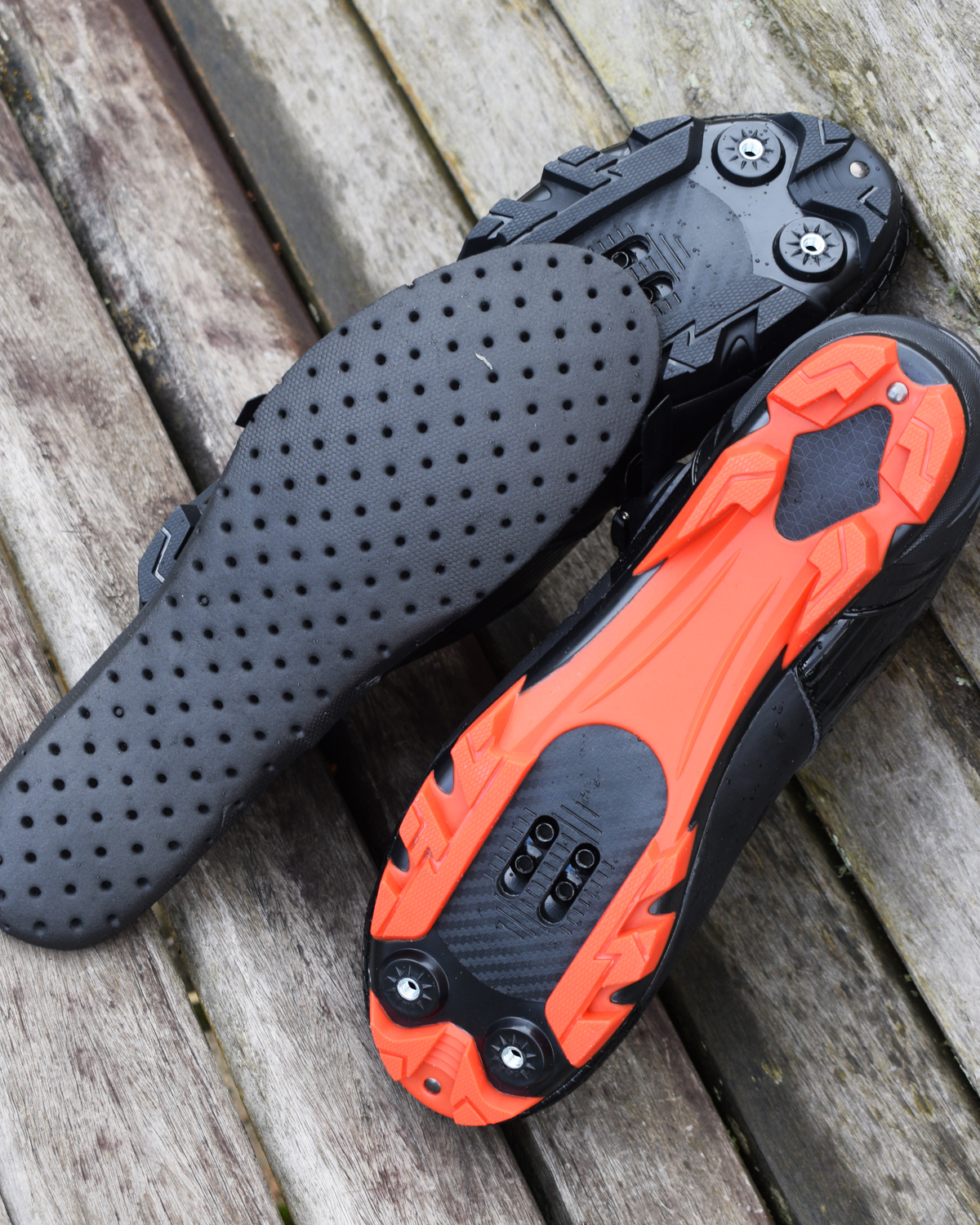 Em sua extremidade, a sapatilha para pedalar conta com dois espaços para colocação de travas extras, que facilitam na hora de caminhar por locais mais íngremes e/ou com muita lama.