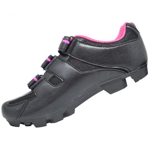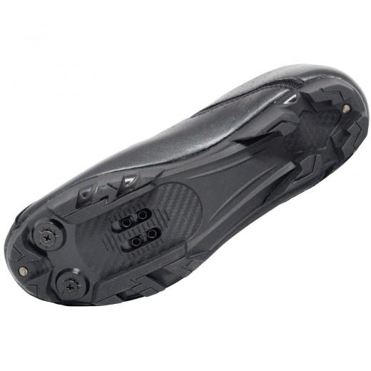 O solado em borracha, conta com pontos mais rígidos na entre sola, afim de favorecer a dissipação da energia aos pedais da bike.