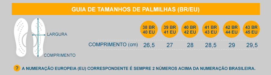 *Em nosso site as numerações já estão convertidas para o padrão Brasil, por isso, não se preocupe ao ver na caixa ou na palmilha uma numeração diferente, já que as sapatilhas são importadas e possuem a numeração padrão Europa (EU) dois números a mais que o padrão do Brasil.