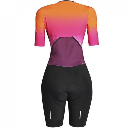 As mangas dos braços e pernas são compostas por filamentos de silicone e elevada compressão, que garantem uma melhor aderência junto à pele da ciclista, sem excesso de pressão e se mantendo no lugar.