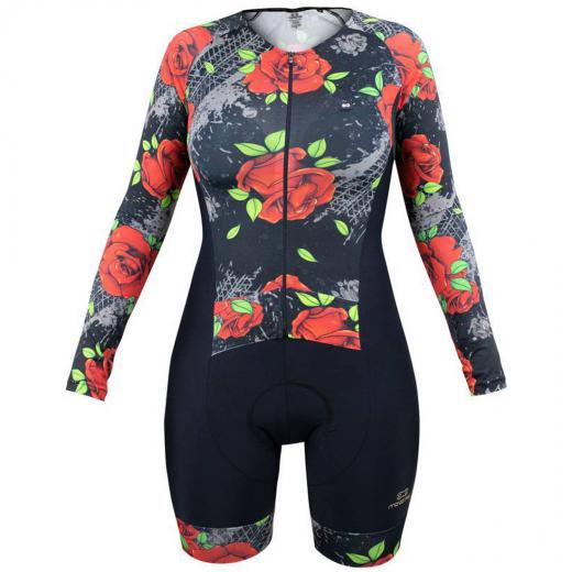Proteção elevada no mtb com muita qualidade no conforto com tecnologia Eco-friendly com o Macaquinho Manga Longa Feminino Marcio May Sport Red Roses combina a tecnologia para o conforto mas ao mesmo tempo manter o rendimento nos treinos e provas.