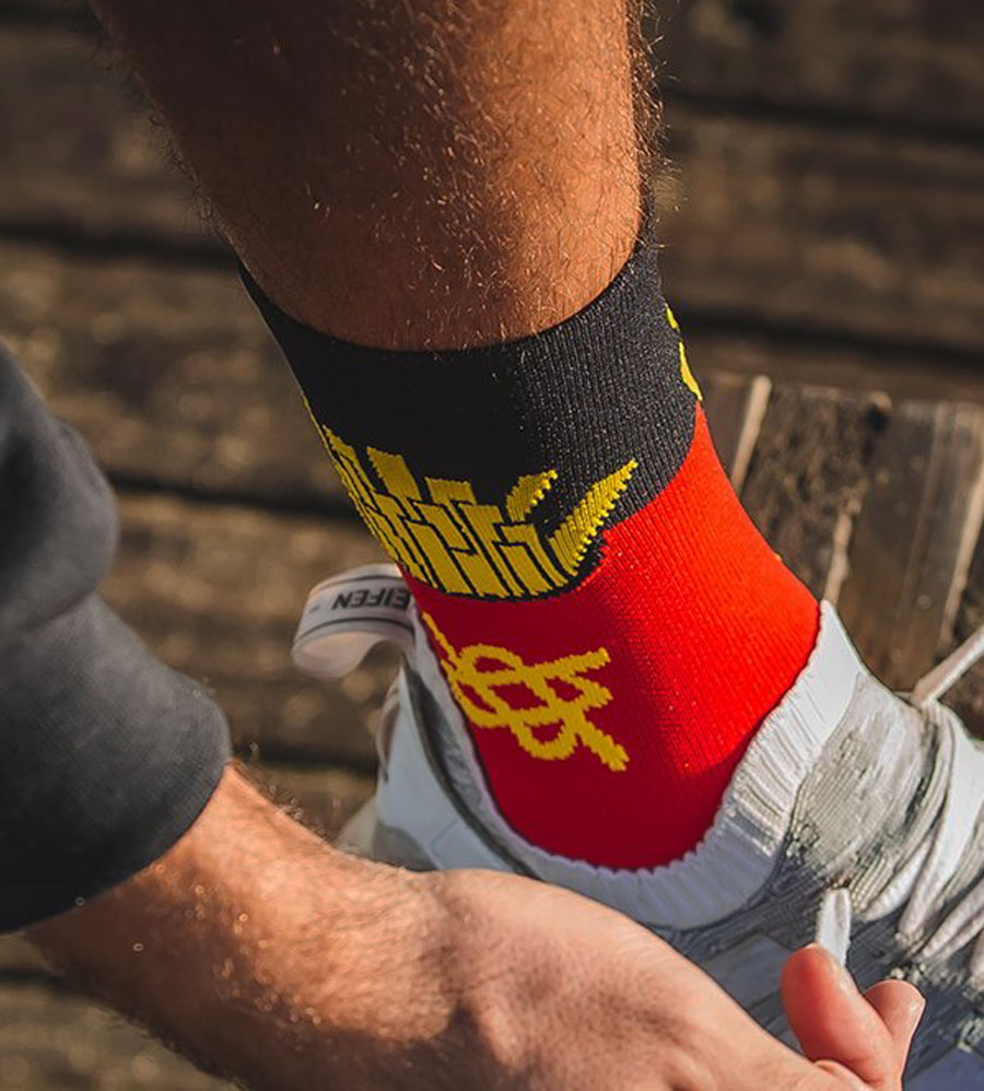 Meia Hupi Fritas possui cores vibrantes e grafismo sublimando, ideal para montar estilos diferenciados para seus pedais, sem perder nada em qualidade.