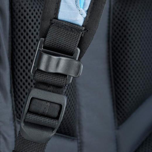 As alças teladas da mochila de hidratação, proporcionam maior respiração e otimizam o controle de umidade. A cinta peitoral possui ajuste de altura e regulagem de comprimento, além de possuir engate em ABS de alta resistência e apito de socorro/sinalização incluído.