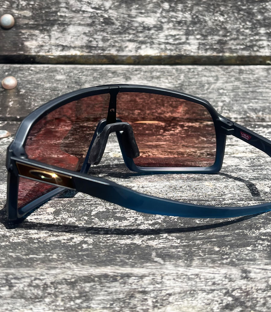 Óculos Oakley Sutro possui construção da ponta das hastes e nosepads (narizeiras) com tecnologia Unobtainium®- muito mais macia e aderente junto ao nariz e parte posterior da cabeça, mesmo com uso por cima das cintas jugulares do capacete de ciclismo, mantendo a segurança nas trepidações mais elevadas e sob altas condições de umidade.