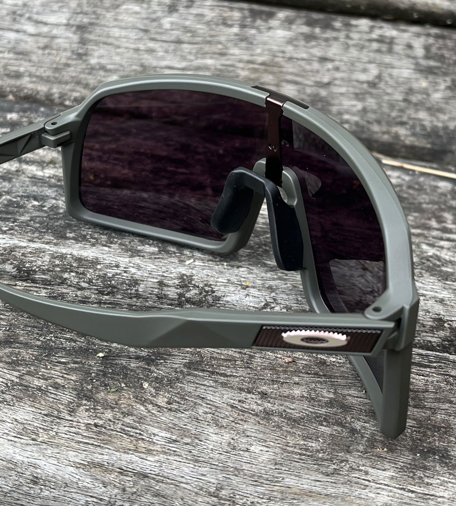 Óculos Oakley Sutro possui construção da ponta das hastes e nosepads (narizeiras) com tecnologia Unobtainium®- muito mais macia e aderente junto ao nariz e parte posterior da cabeça, mesmo com uso por cima das cintas jugulares do capacete de ciclismo, mantendo a segurança nas trepidações mais elevadas e sob altas condições de umidade.