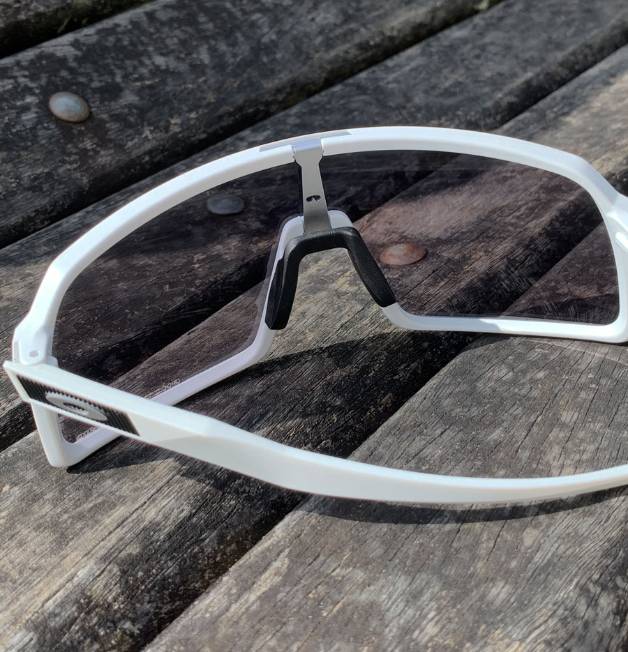 Óculos Oakley Sutro possui construção da ponta das hastes e nosepads (narizeiras) com tecnologia Unobtainium®- muito mais macia e aderente junto ao nariz e parte posterior da cabeça, mesmo com uso por cima das cintas jugulares do capacete de ciclismo, mantendo a segurança nas trepidações mais elevadas e sob altas condições de umidade.