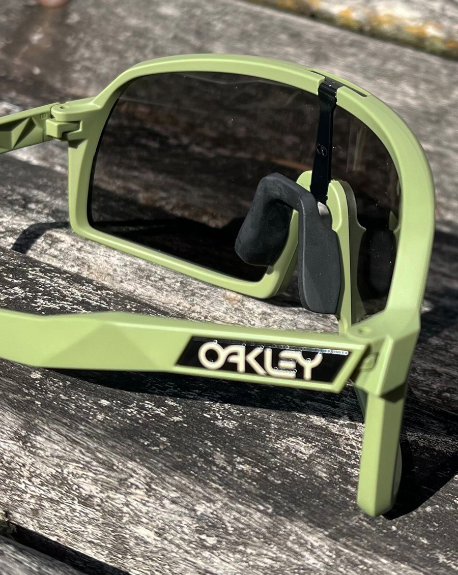 Óculos Oakley Sutro S Chrysalis Matte Fern/Prizm Grey possui construção da ponta das hastes e nosepads (narizeiras) com tecnologia Unobtainium®- muito mais macia e aderente junto ao nariz e parte posterior da cabeça, mesmo com uso por cima das cintas jugulares do capacete de ciclismo, mantendo a segurança nas trepidações mais elevadas e sob altas condições de umidade.