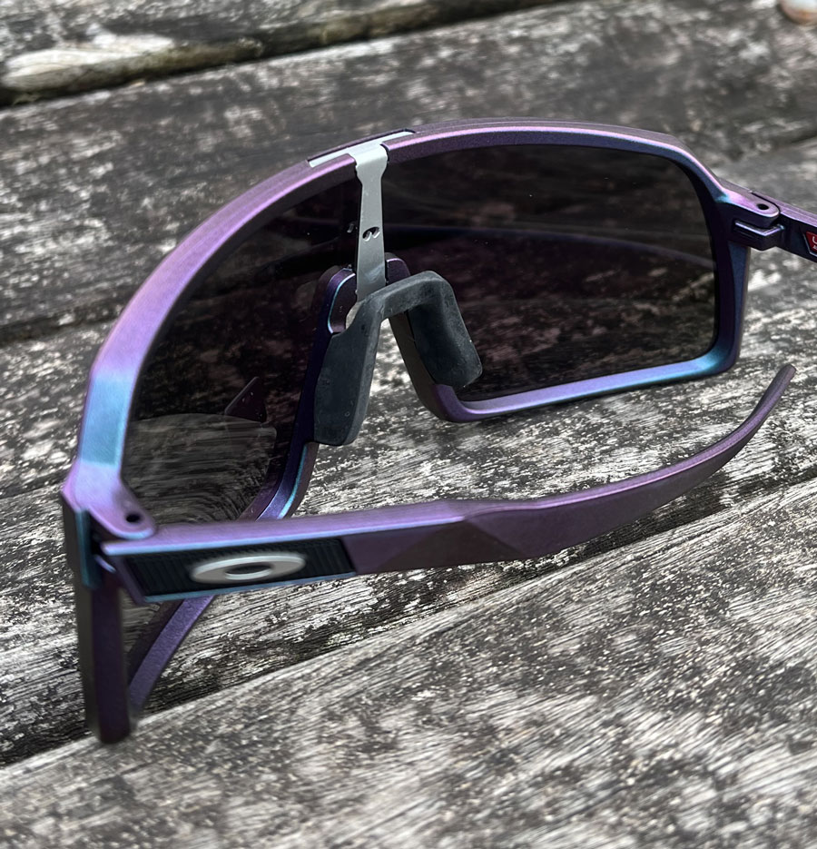 Óculos Oakley Sutro possui construção da ponta das hastes e nosepads (narizeiras) com tecnologia Unobtainium®- muito mais macia e aderente junto ao nariz e parte posterior da cabeça, mesmo com uso por cima das cintas jugulares do capacete de ciclismo, mantendo a segurança nas trepidações mais elevadas e sob altas condições de umidade.