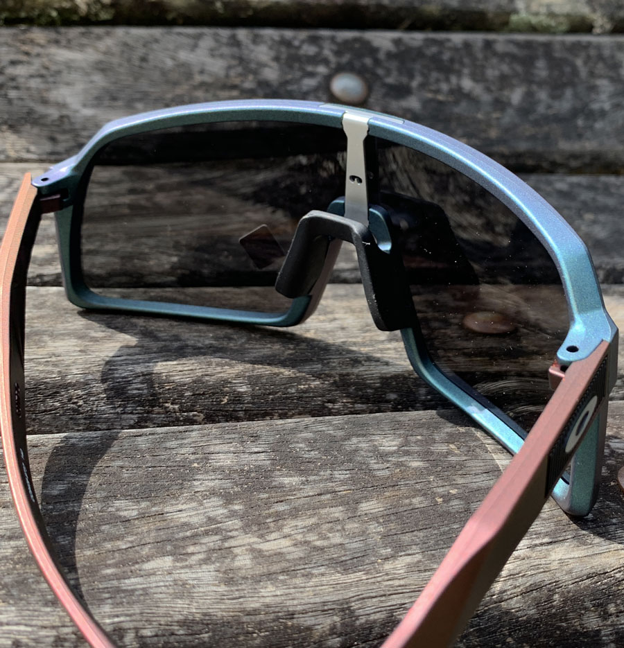 Óculos Oakley Sutro possui construção da ponta das hastes e nosepads (narizeiras) com tecnologia Unobtainium®- muito mais macia e aderente junto ao nariz e parte posterior da cabeça, mesmo com uso por cima das cintas jugulares do capacete de ciclismo, mantendo a segurança nas trepidações mais elevadas e sob altas condições de umidade.