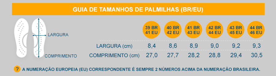 *Em nosso site as numerações já estão convertidas para o padrão Brasil, por isso, não se preocupe ao ver na caixa ou na palmilha uma numeração diferente, já que as sapatilhas são importadas e possuem a numeração padrão Europa (EU) dois números a mais que o padrão do Brasil.