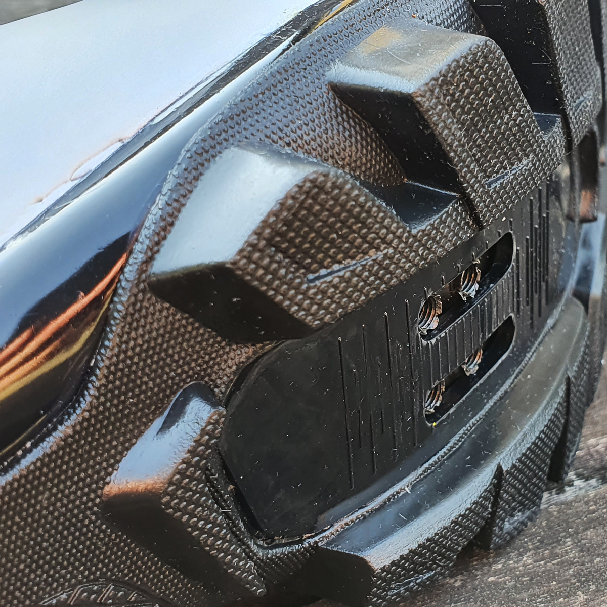 • Solado com dupla composição - Em nylon® e borracha termoplástica, permite que a transferência de potência para os pedais seja eficiente, sem deixar de lado o conforto ao caminhar