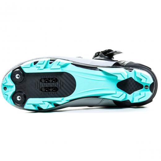 • Solado em dupla composição - produzido em nylon® e borracha termoplástica, possibilita  que a transferência de potência para os pedais seja mais eficiente, sem deixar de lado o conforto ao pedalar e caminhar