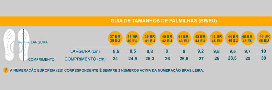 *Em nosso site as numerações já estão convertidas para o padrão Brasil, por isso, não se preocupe ao ver na caixa ou na palmilha uma numeração diferente, já que as sapatilhas são importadas e possuem a numeração padrão Europa (EU) dois números a mais que o padrão do Brasil.